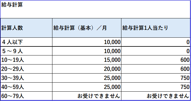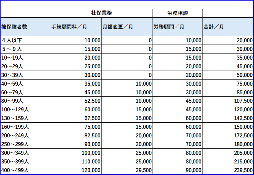 社保業務と労務相談の月次の顧問料(目安)です。お見積もりの前に諸事情を伺い、顧問料が変更になることがあります。社保業務のうち、賞与支払届、算定基礎届、労災、労働保険料概算確定保険料申告、育児、介護、高年齢の雇用継続給付、事業所関係の手続きは別途費用が掛かります。500人以上の規模の企業の委託も可能です。